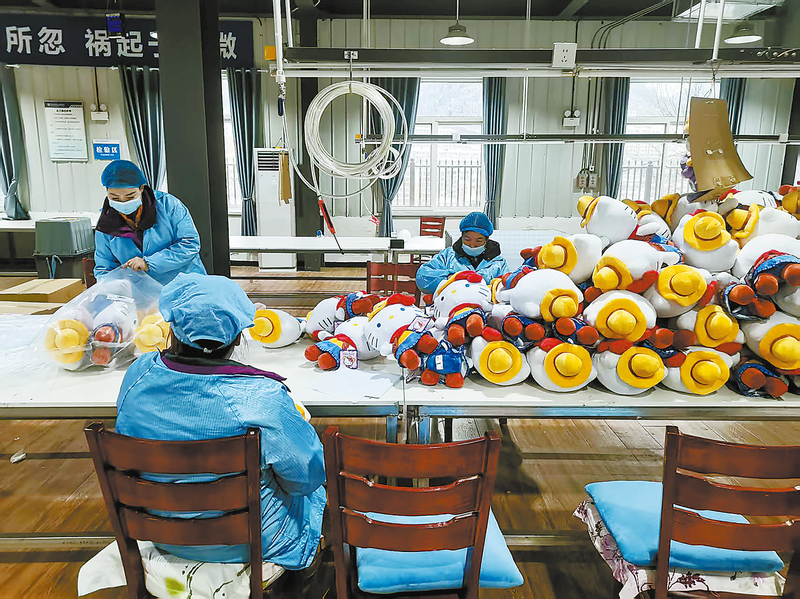 工人們身著防護服,在車間趕制毛絨玩具。