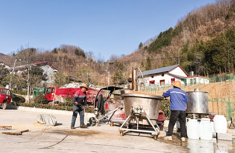 “春釀新醅邀日月,風(fēng)攜酒香漫山村”。仲春時節(jié),鎮(zhèn)安縣高峰鎮(zhèn)長坡村,青山含黛,清泉潺潺。4月7日,和煦的陽光灑進長坡村的一個農(nóng)家小院,作坊里熱氣氤氳,糧香、曲香交織彌漫。這里沒有春日的慵懶閑適,只有一派熱火朝天的忙碌——粉碎玉米的聲響、蒸煮糧食的沸騰聲、師傅們扯著嗓子的交談聲,匯成一曲春日生產(chǎn)的奮進樂章。師傅們各司其職,從粉碎、拌曲到入缸、封窖,每一步都嚴謹細致,每一招都飽含匠心,將世代相傳的秦嶺古法釀酒技藝,在春光里演繹得淋漓盡致。
