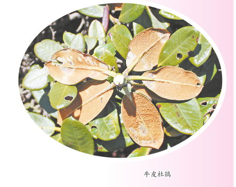 牛皮杜鵑的葉子背面形似牛皮,是墊狀植株匍匐在地上連片生長(zhǎng),有保護(hù)植被、水土的作用。開(kāi)花時(shí),人可以睡在花叢中。它開(kāi)花較遲,一般5月20日前后盛開(kāi)。