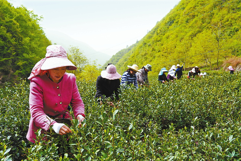 茶園里,成片的茶樹(shù)吐露嫩綠新芽,隨處可見(jiàn)采茶人忙碌的身影。