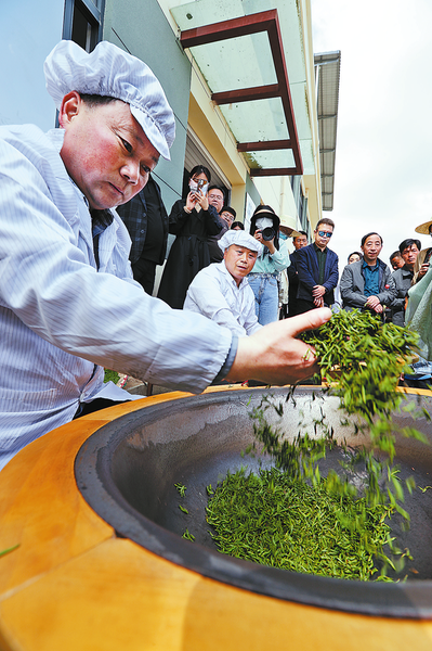 南京市高淳區(qū)援商技術(shù)人員、高級(jí)制茶師卜維梁現(xiàn)場(chǎng)教授制茶技藝。 (本報(bào)記者 方 立 攝)