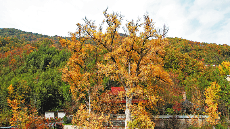東甘溝銀杏園里,一雄一雌兩棵銀杏樹,相距7米,樹齡均1700多年,根系盤結(jié),枝丫交錯。兩棵古樹樹高均超過40米,樹冠直徑30多米,并立的銀杏樹宛如一對耳語廝磨的情侶,故而稱其為“夫妻”銀杏樹。東甘溝也因“夫妻”銀杏樹,而成為遠(yuǎn)近聞名的銀杏觀賞地。