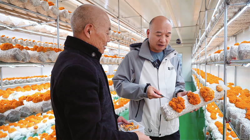 1月15日,在柞水縣山城美農(nóng)生態(tài)農(nóng)業(yè)科技有限公司的金耳種植區(qū)里,企業(yè)負(fù)責(zé)人陳盛林(右)檢查金耳生長情況。 (本報通訊員 李沁杰 攝)