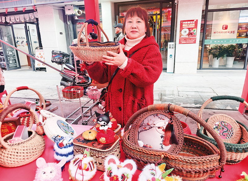 非遺年貨集市上,手工藝人展示質(zhì)樸精巧的傳統(tǒng)麻繩編筐。