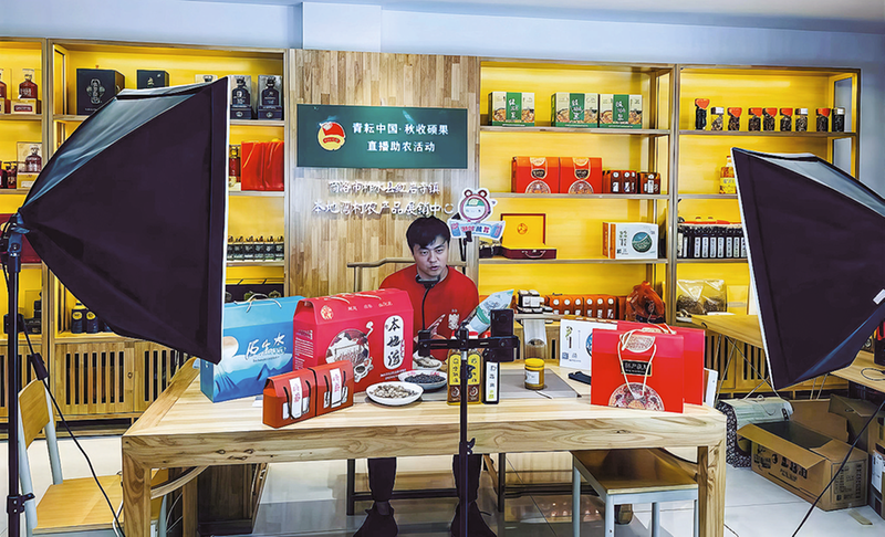 △主播正在直播推介當(dāng)?shù)氐奶厣r(nóng)副產(chǎn)品。